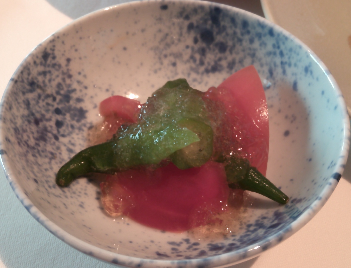 | トマトとオクラの土佐酢ジュレ | 飛鳥豚のソテー ジンジャーソース |