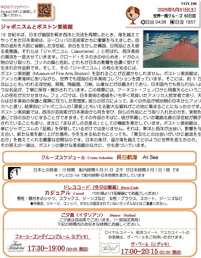 天気:曇時々雨 気温:15℃ 12℃ 日本との時差13時間に船の昼12時は翌6月1日の午前1時 今日も昼デザートを食べながら生バンド